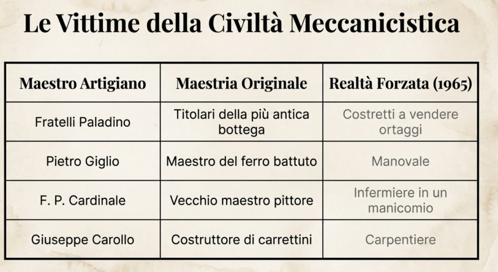 Vengono amaramente elencati i nomi dei “vinti” dalla civiltà meccanicistica: i fratelli Paladino, titolari della più antica bottega di Bagheria, sono ridotti a vendere ortaggi per sopravvivere; Pietro Giglio, Maestro del ferro battuto, è costretto a fare il manovale; Francesco Paolo Cardinale, Vecchio maestro pittore, è finito a fare l’infermiere in un manicomio.
