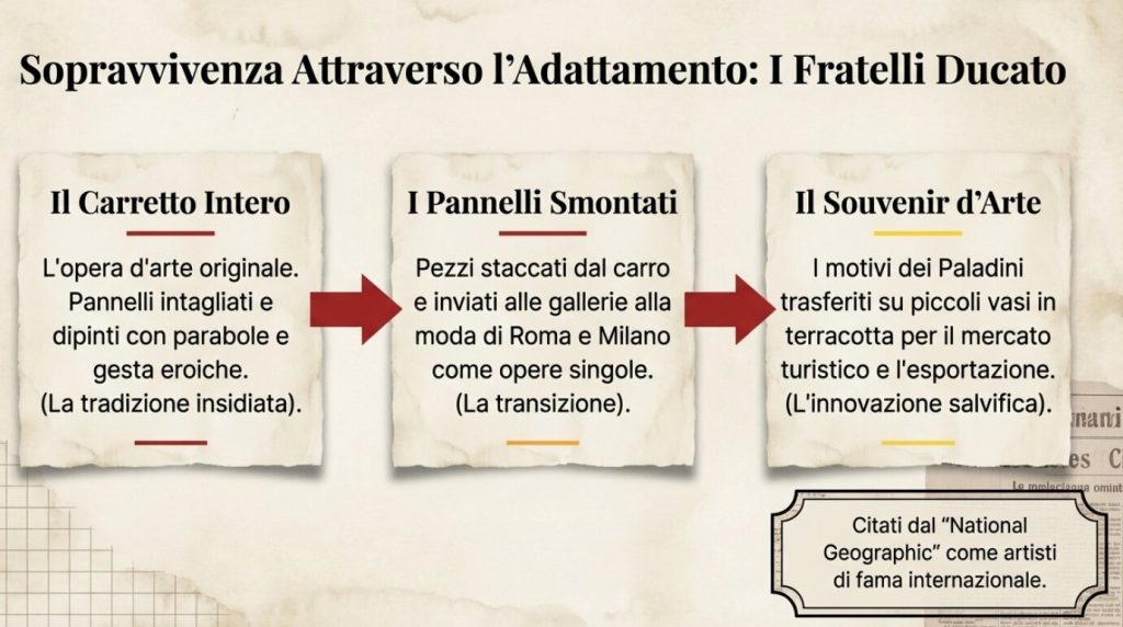 Nonostante il prestigio – testimoniato da citazioni su riviste estere come il “National Geographic” – l’articolo denuncia una crisi profonda: molti maestri intagliatori, fabbri e pittori sono costretti a cambiare mestiere, diventando manovali, infermieri o venditori ambulanti per sopravvivere. I Fratelli Ducato sono presentati non solo come custodi del passato, ma come innovatori che, per necessità, inventano il moderno “souvenir” d’arte (i vasi in terracotta dipinti) per mantenere viva la propria identità creativa.
