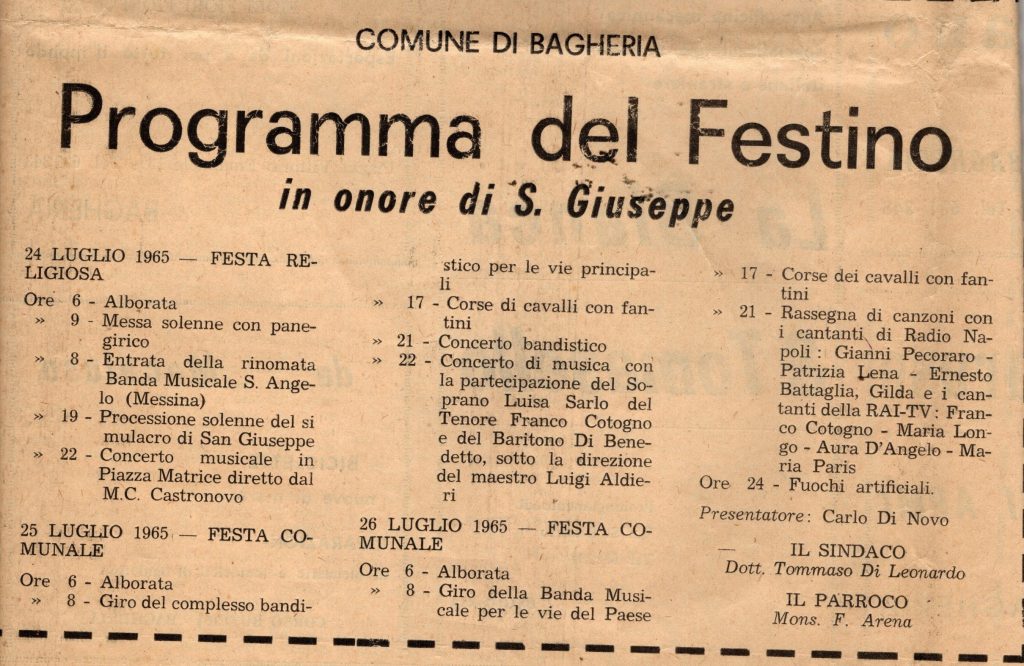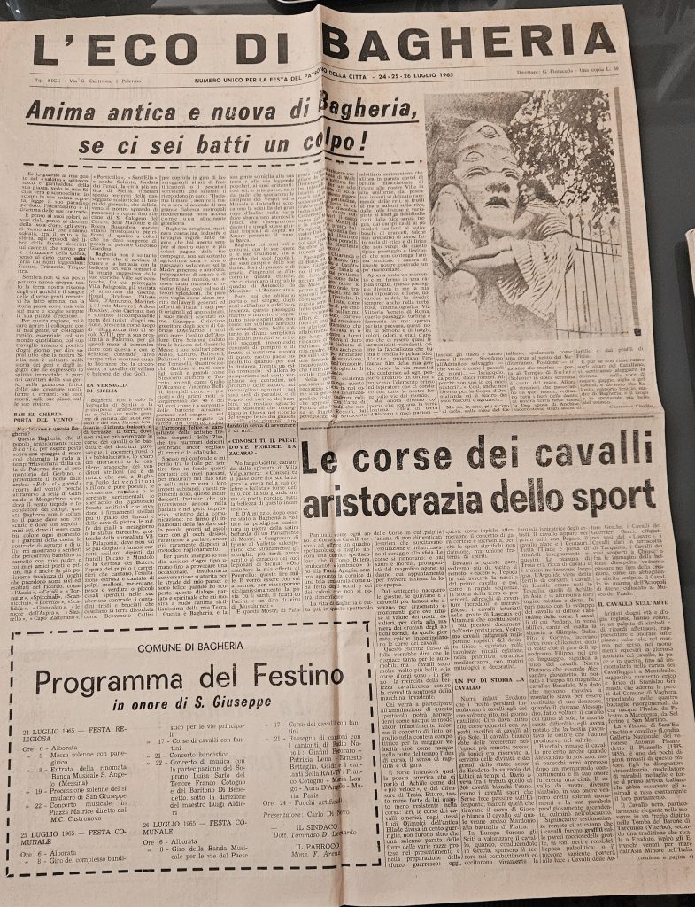 Ho trovato nell’archivio di mio padre una copia de “L’eco di Bagheria”, un numero unico di 4 pagine pubblicato il 24-25-26 luglio 1965 in occasione della festa di S. Giuseppe, patrono del paese. Direttore del giornale era Giuseppe Pintacuda, detto “Pippinieddu”, ingegnoso poeta dialettale bagherese.