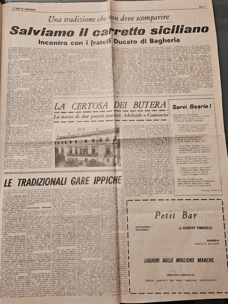 Di grande interesse è un articolo a pag. 3, non firmato e intitolato “Una tradizione che non deve scomparire – Salviamo il carretto siciliano – Incontro con i fratelli Ducato di Bagheria”.