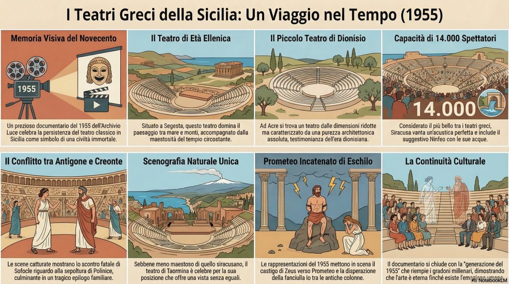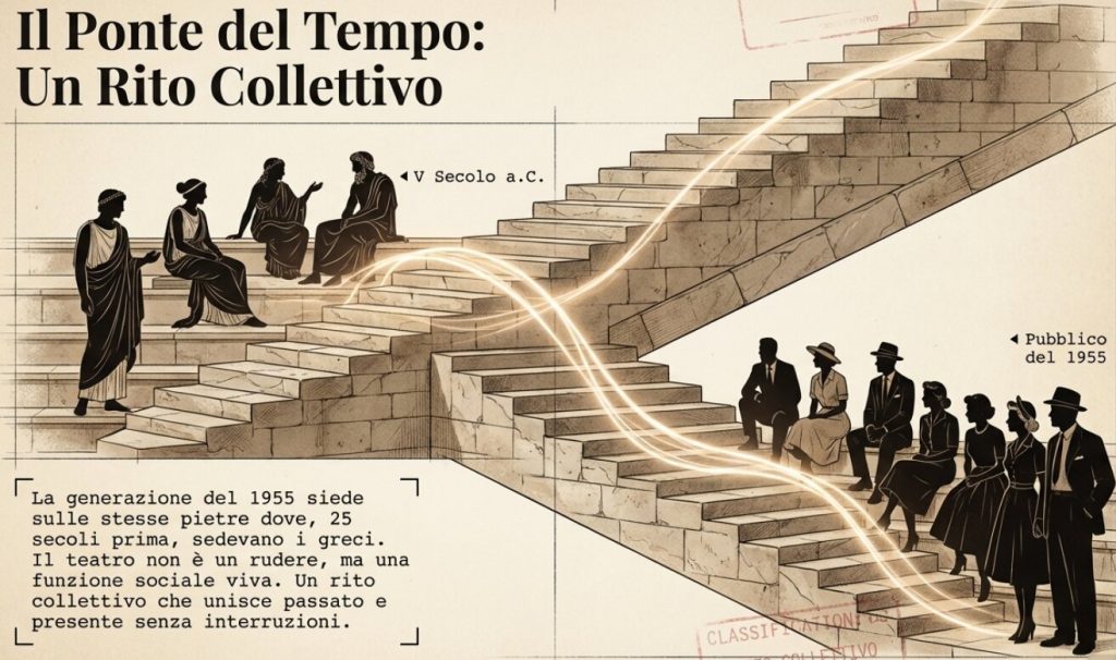 L’immagine più potente è quella della “generazione del 1955”: uomini in abito scuro, donne con cappellini d’epoca, tutti usciti da pochi anni dalla devastante esperienza della guerra, seduti sugli stessi gradoni di pietra dove venticinque secoli prima sedevano i cittadini greci. Le riprese delle rappresentazioni teatrali ci permettono di vedere come venivano interpretati i testi di Sofocle ed Eschilo a metà del secolo scorso, con una recitazione enfatica e scenografie che sfruttavano la drammaticità naturale dei siti.