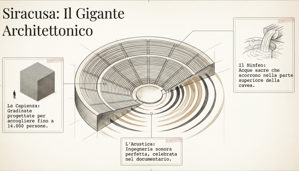 Ci si sposta poi al teatro greco di Siracusa, definito il più bello tra i teatri greci: il commento ne sottolinea la maestosità, l’acustica perfetta e la capacità di ospitare fino a 14.000 persone; viene mostrato anche il Ninfeo con le sue acque.