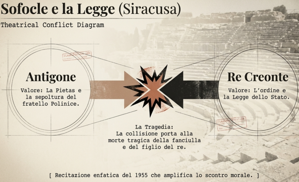 Il documentario preserva poi alcuni rari frammenti di allestimenti di tragedie greche dell’epoca, caratterizzati da una recitazione enfatica e solenne: a Siracusa, le immagini catturano l’“Antigone” di Sofocle, allestita nel 1954 da Guido Salvini e interpretata da Lilla Brignone (Antigone), Salvo Randone (Creonte), Elena Zareschi (Ismene) e Annibale Ninchi (Tiresia); la traduzione, molto arcaica, era di Eugenio Della Valle.