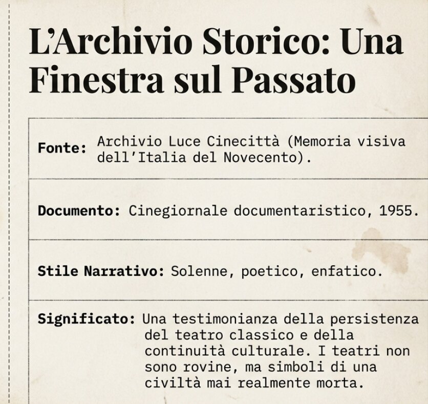 Questo viaggio nel tempo attraverso le immagini del 1955 (anche il famoso film “Ritorno al futuro” di Robert Zemeckis tornava a quell’anno) ci riconnette con una verità che spesso dimentichiamo: l’arte sopravvive sempre se c’è qualcuno pronto ad amarla e a farla sua; i teatri greci della Sicilia non sono silenziose reliquie, ma macchine progettate per far battere il cuore.