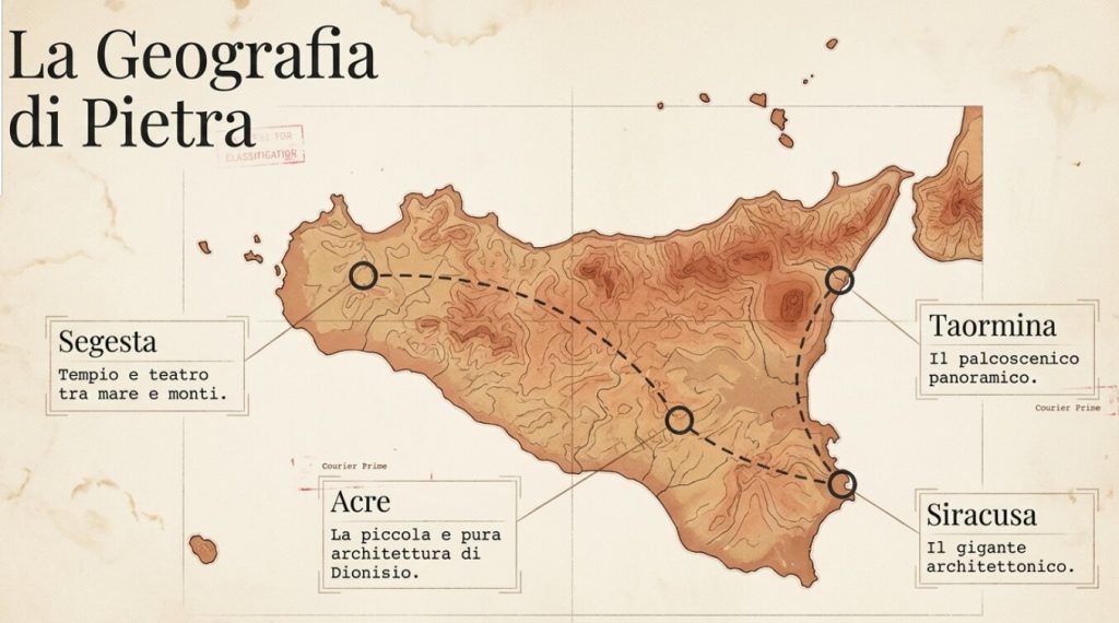 Il viaggio inizia a Segesta, lodando il tempio e il teatro di età ellenica che domina il mare e i monti. Viene poi mostrato il piccolo ma architettonicamente puro teatro di Acre (Akrai) a Palazzolo Acreide: costruito sotto il regno di Dionisio, questo teatro di piccole dimensioni è un gioiello di precisione formale. In un teatro piccolo, il rapporto tra attore e spettatore diventa intimo, quasi confessionale: Acre insegna che l’impatto di un’opera non si misura in metri quadri, ma nella capacità dello spazio di concentrare l’energia del dramma in un punto di assoluta armonia.