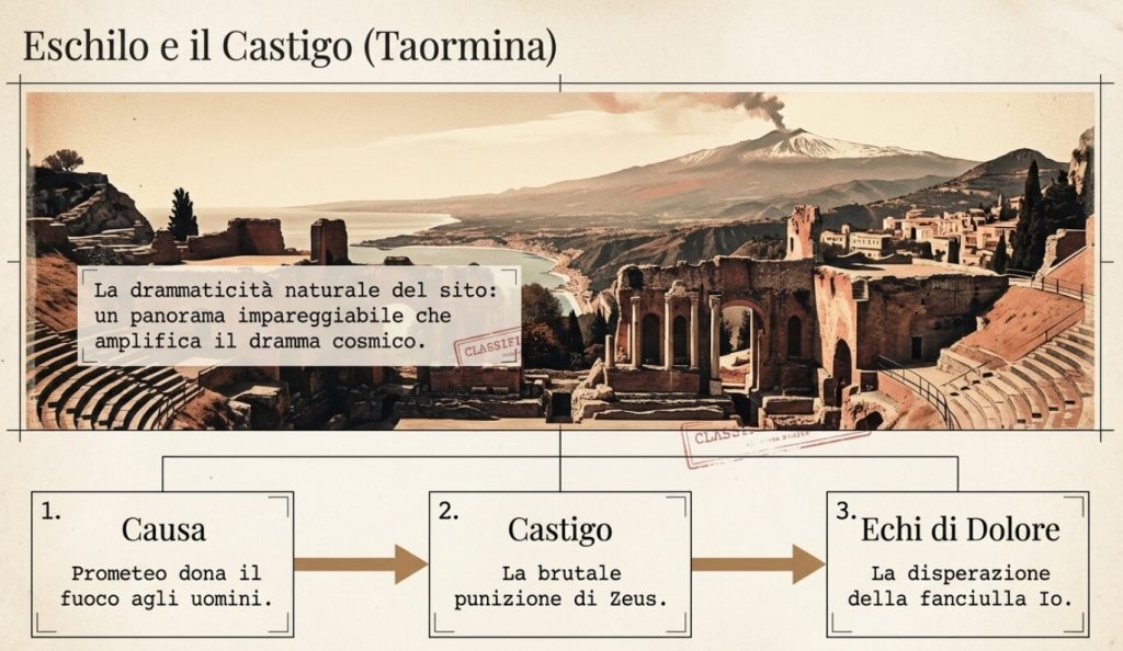 Le immagini presentano poi il teatro di Taormina, definito meno maestoso ma impareggiabile per posizione e panorama; vengono mostrate scene del “Prometeo Incatenato di Eschilo”, interpretato da un giovane Vittorio Gassman e da Anna Proclemer.