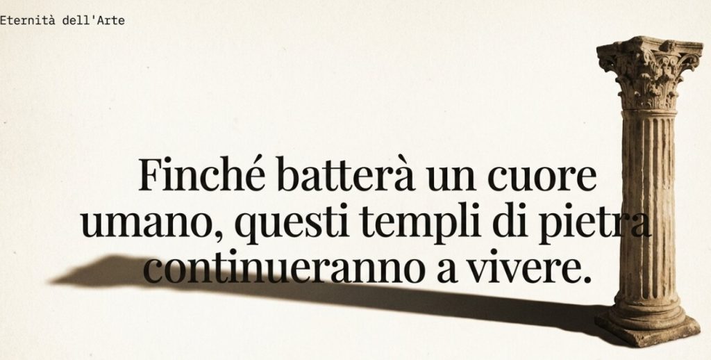 Il filmato si chiude con una riflessione sull’eternità dell’arte, affermando che finché batterà un cuore umano, questi “templi” di pietra continueranno a vivere.